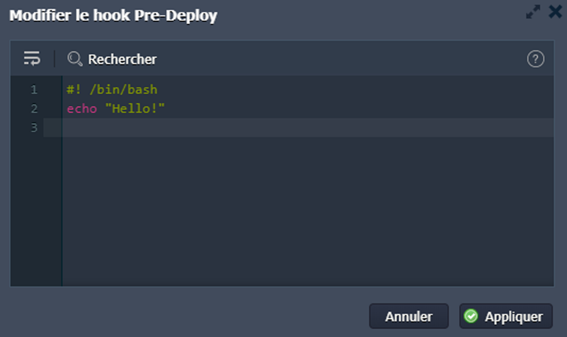 Astuce : Si nécessaire, vous pouvez utiliser la commande de sortie (exit) permettant de briser votre Hook et l'exécution de l'opération de déploiement / construction appropriée à tout moment. Ici, la valeur 0 (c'est-à-dire exit 0) est utilisée pour indiquer le succès, tandis que toute autre valeur suppose une erreur (par exemple exit 1).