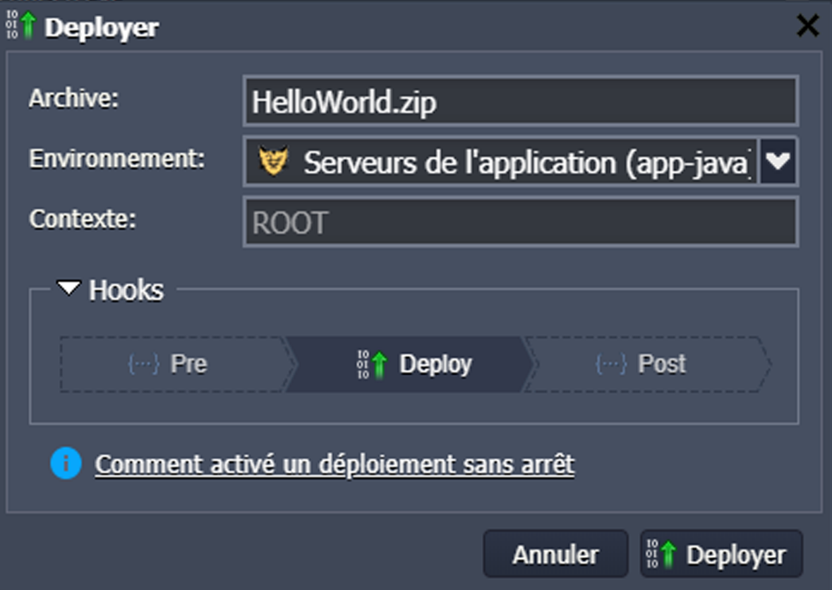 Faisant partie du processus de déploiement, les Hooks sont disponibles dans une section extensible du formulaire approprié du tableau de bord. Ainsi, pour gérer les Hooks, accédez au dialogue de déploiement de l'application en utilisant l'une des options suivantes :