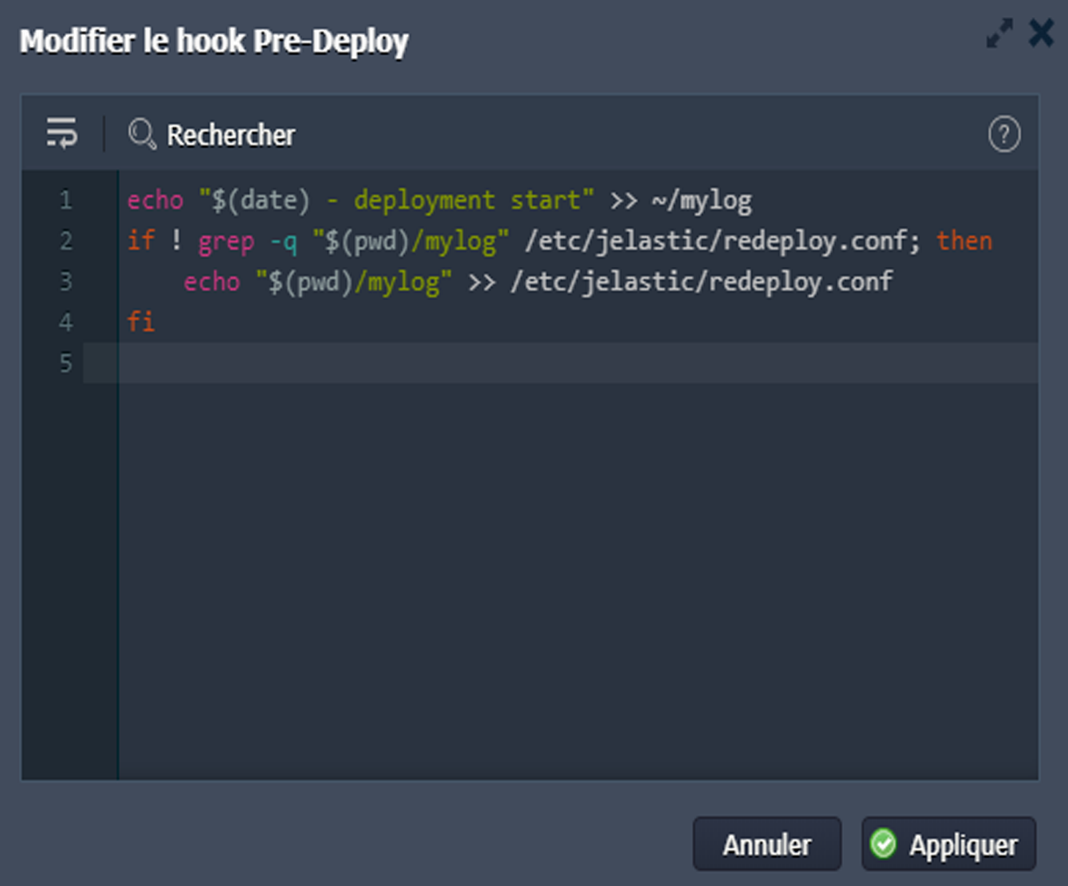 4. Enfin, déployez votre application et vérifiez les fichiers mylog et redeploy.conf pour vous assurer de la bonne exécution des Hooks.