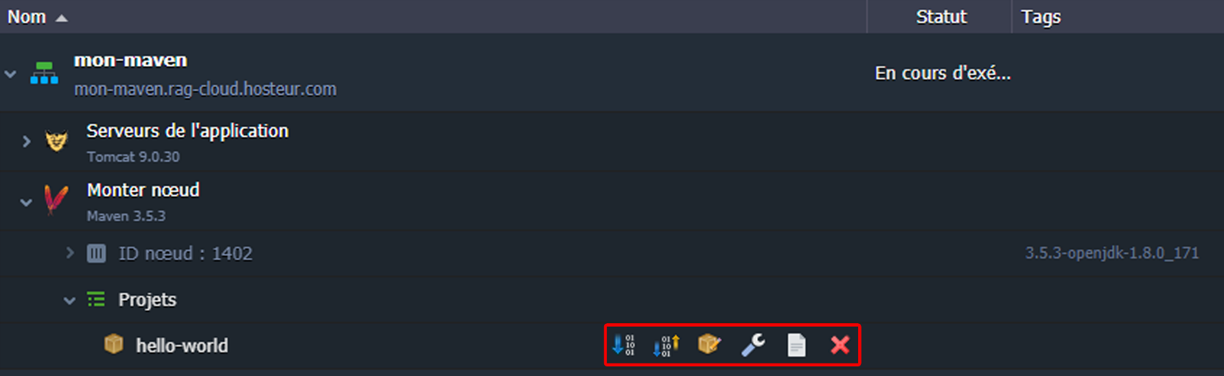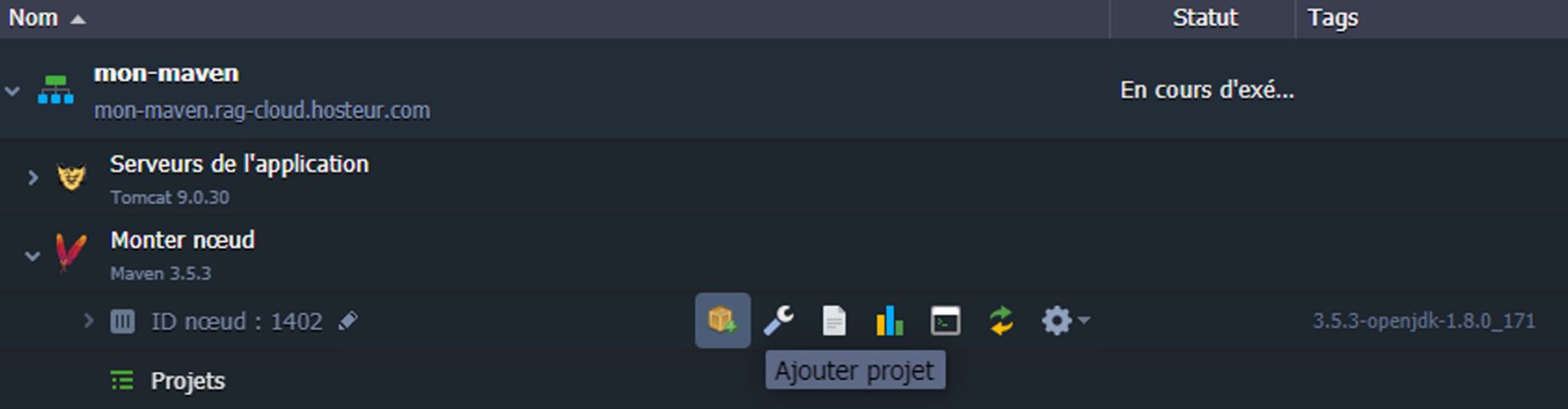 Maven est un outil de gestion et d'automatisation de production des projets, qui est principalement utilisé pour la programmation Java. Avec RAGNARØKKR PaaS, vous pouvez ajouter tout projet public ou privé directement depuis votre référentiel de système de contrôle de version (VCS) en utilisant le type de lien approprié : http, https ou svn pour SVN et git, http, https ou ftp pour Git. Après ajout, les projets Java peuvent être déployés sur les serveurs d'application appropriés en utilisant le nœud de construction Maven.