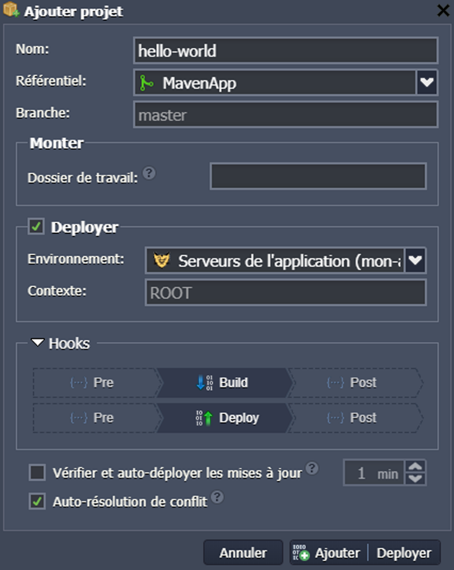 • Référentiel : permet de sélectionner le projet Git / SVN dans le gestionnaire de déploiement (ou de passer à son formulaire d'ajout)
