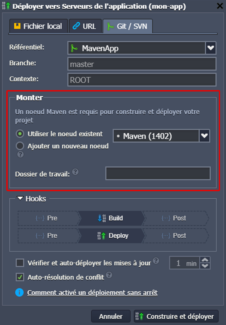 - Monter : permet de sélectionner le nœud de construction Maven existant ou d'en ajouter un dans l'environnement cible