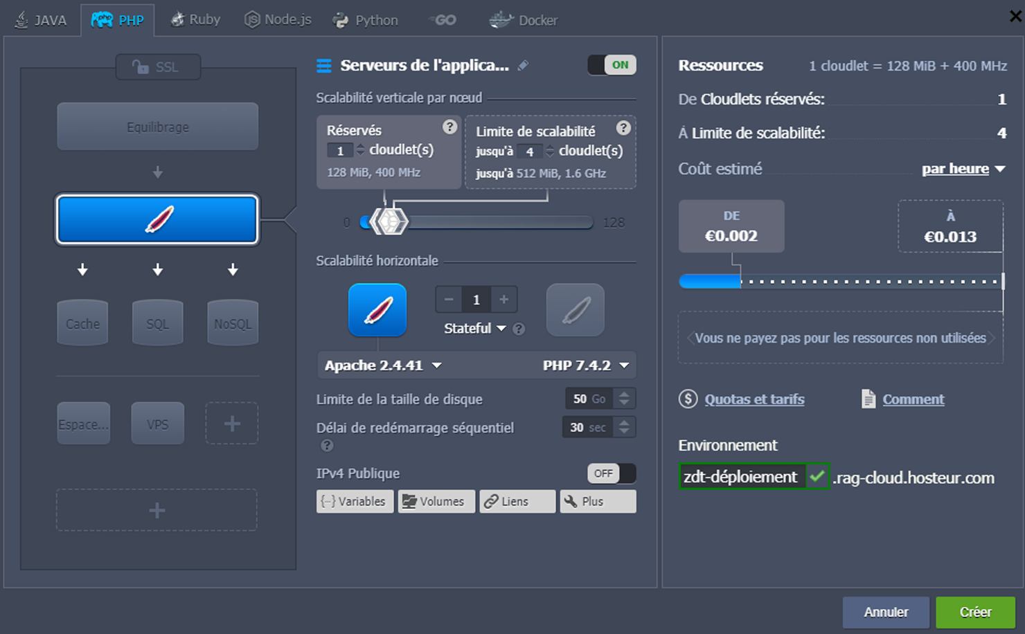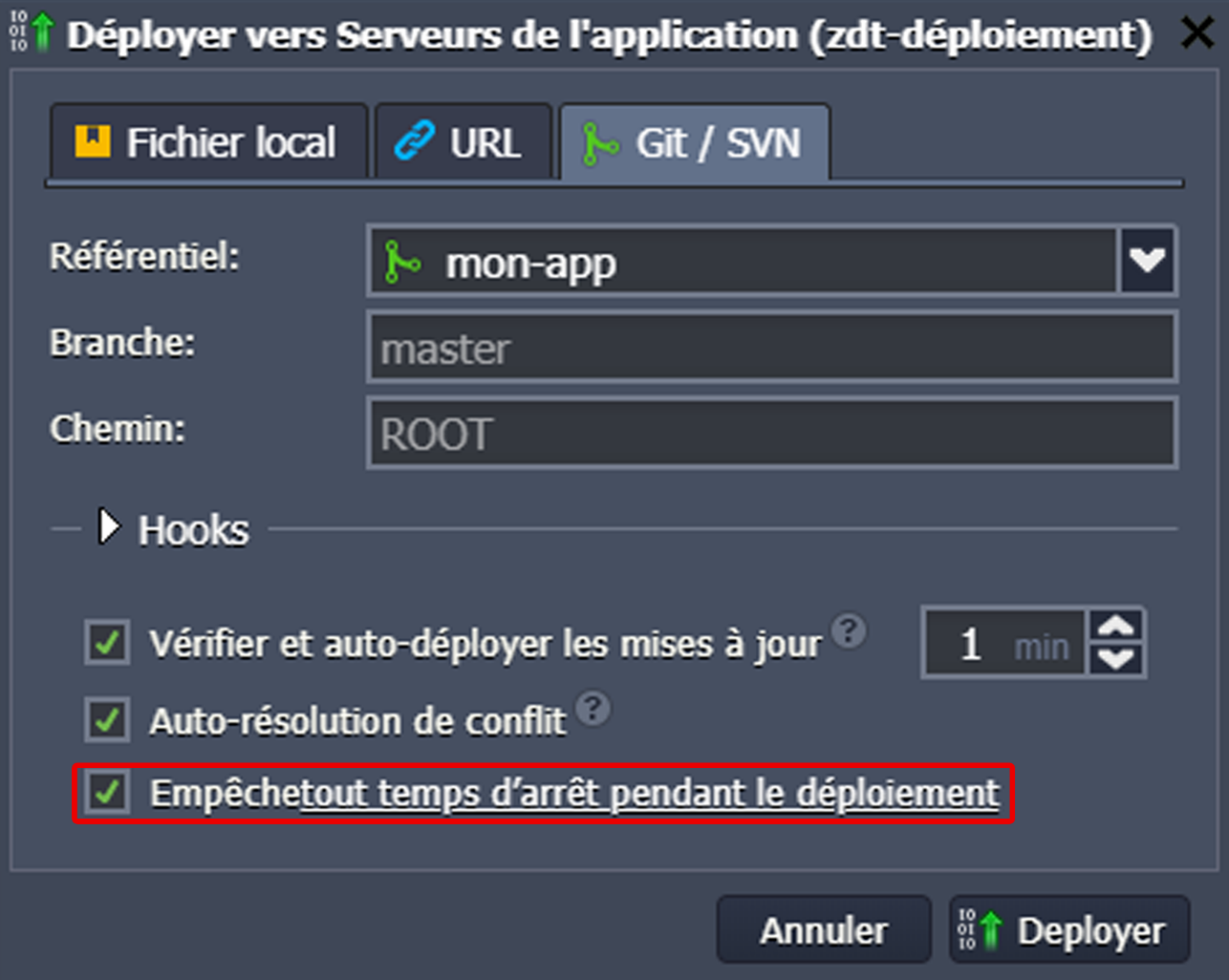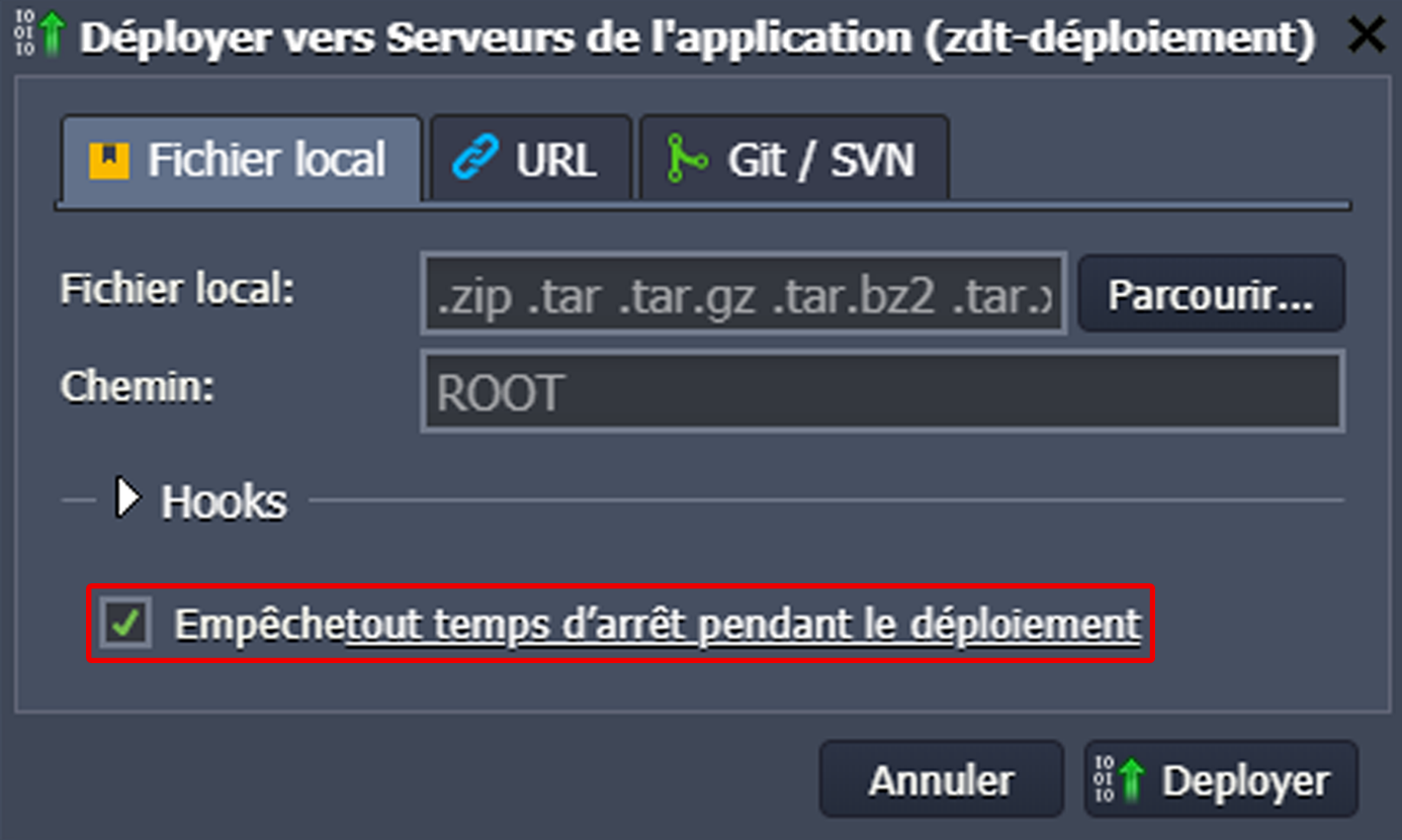 - L'option « Empêche tout temps d'arrêt pendant le déploiement » (ZDT) ne devient actif que lors du déploiement dans le contexte ROOT de votre serveur d'application PHP. Dans le cas contraire, la méthode classique sera utilisée.