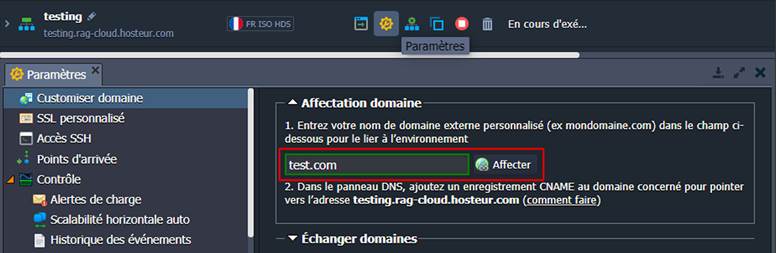 1. Ouvrez les Paramètres de votre environnement cloné (dans notre cas, l’environnement testing) et liez le domaine (par exemple, test.com) que vous avez acheté précédemment.