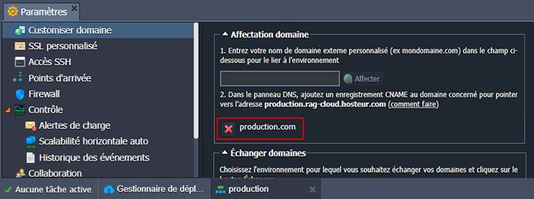Notez que votre environnement de production doit également avoir un domaine personnalisé lié avant (par exemple, production.com).