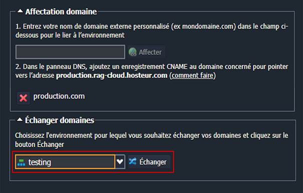 3. Choisissez l'environnement avec lequel vous souhaitez échanger vos domaines (dans notre cas, l'environnement testing) et appuyez sur le bouton Echanger. Tout de suite après, les noms de domaine externes des deux environnements seront échangés.