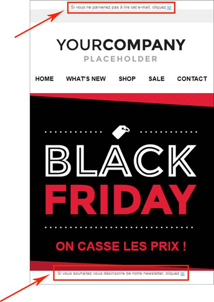 L’entête et le pied de page contiennent respectivement le lien miroir et le lien de désinscription dans les textes entre accolades ({……}).