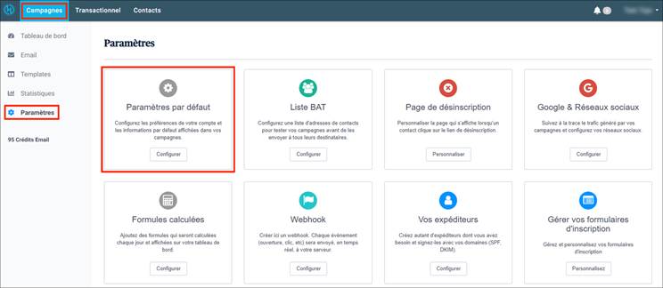- Allez dans les Paramètres par défaut qui se trouvent dans Campagnes > Paramètres > Paramètres par défaut