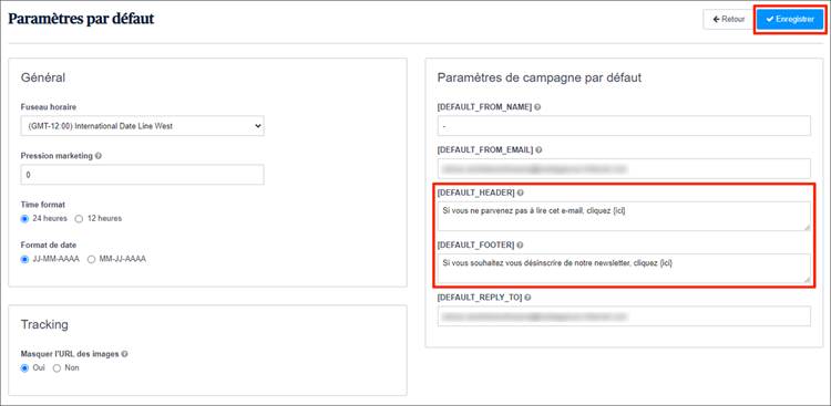 Vous pouvez les changer par les textes de votre choix. Cela peut être pratique si vous voulez toujours garder le même entête et le même pied de page pour toutes vos campagnes.