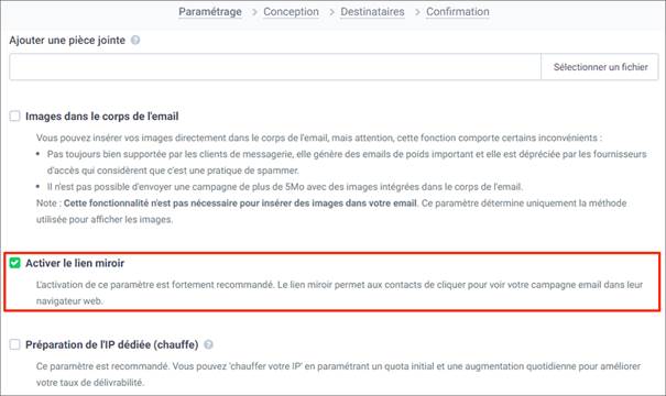 - Pour afficher l’entête par défaut dans votre email, vous devez Activer le lien miroir à l’étape de Paramétrage, dans les Options avancées, lors de la création de votre campagne email.