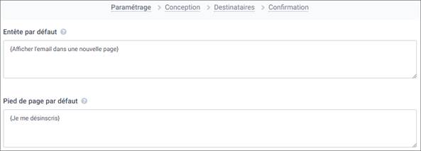 A la première étape de la création de votre campagne (étape de Paramétrage), saisissez directement vos textes dans les champs « Entête par défaut » et « Pied de page par défaut », qui se trouvent dans les Options avancées. N’oubliez pas d’insérer les liens cliquables, qu’il faut mettre entre accolades ({…..}).