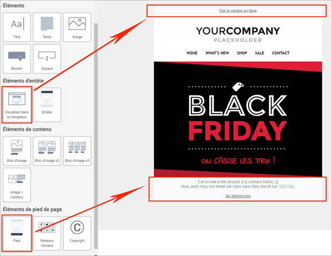 Dans l’éditeur Drag & Drop, à l’étape de Conception de votre email, vous pouvez également ajouter facilement l’élément d’entête « Visualiser dans le navigateur » contenant le lien miroir, et l’élément de pied de page « Pied » contenant le lien de désinscription. Dans ce cas, il n’est plus nécessaire de cocher l’option « Activer le lien miroir » dans l’étape de Paramétrage de votre campagne.