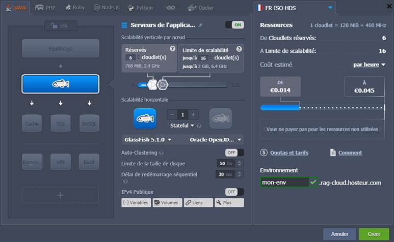 2. Choisissez GlassFish comme serveur d'application et spécifiez les limites des cloudlets pour celui-ci. Ensuite, tapez le nom de votre environnement et cliquez sur le bouton Créer.