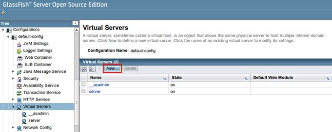 7. Une fois votre application déployée avec succès, naviguez vers Configurations > Default-config > Virtual Servers et cliquez sur le bouton New afin de créer un nouveau serveur virtuel.