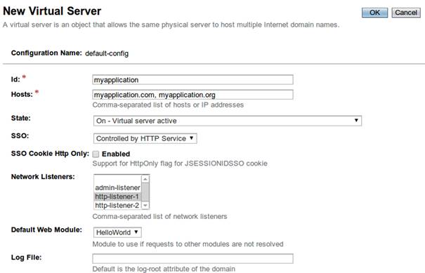 8. Saisissez l'ID du nouveau serveur, spécifiez les domaines personnalisés liés à votre environnement dans le champ Hosts, séparés par des virgules, puis sélectionnez le http listerner approprié et choisissez le module web nécessaire.