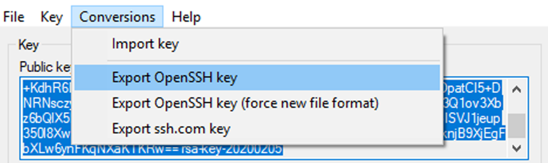 Pour obtenir la clé privée pour l'authentification dans votre dépôt GIT distant via SSH : développez le menu Conversions et sélectionnez l'option Export OpenSSH key