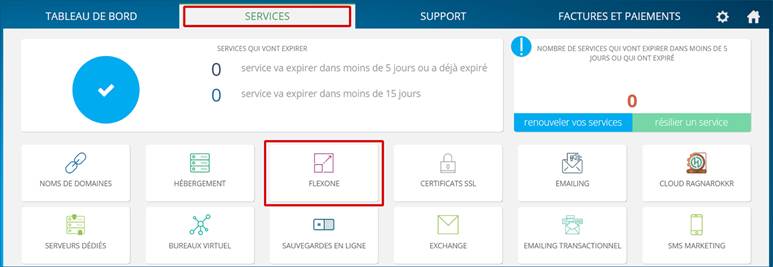 1. Allez dans votre Espace Client (la page de connexion se trouve ici : https://manager.hosteur.com/), rubrique « Services » puis « Flexone ».