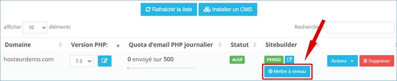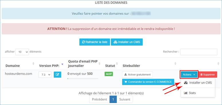 Remarque : vous pouvez aussi trouver l’option Installer un CMS en cliquant sur Actions, dans la liste de vos domaines.