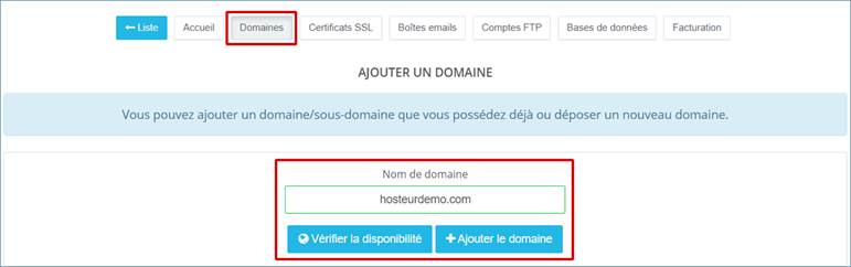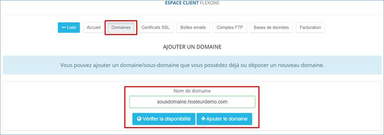 Dans ce document, nous avons déjà créé et ajouté le domaine hosteurdemo.com dans Flexone. Vous pouvez aussi vous référer à notre documentation « Gestion Hébergement FLEXONE ».