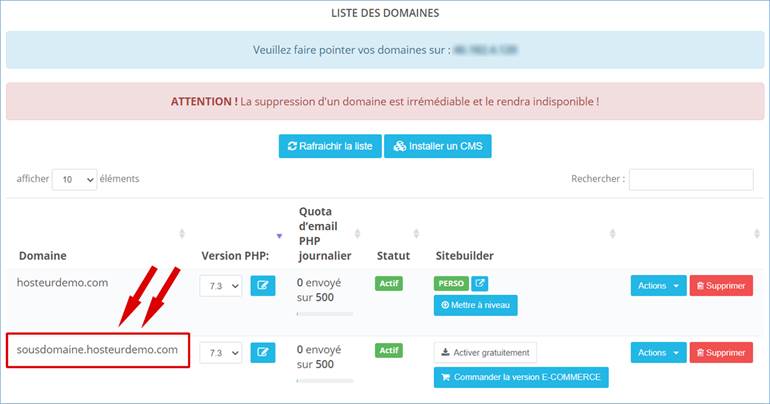 Lorsque votre sous-domaine a été ajouté, il devrait apparaître dans la liste.
