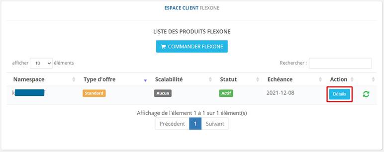 Vous devez dans un premier temps ajouter votre domaine dans votre Espace Client. Entrez dans la rubrique Services >> Flexone, cliquez sur Détails.