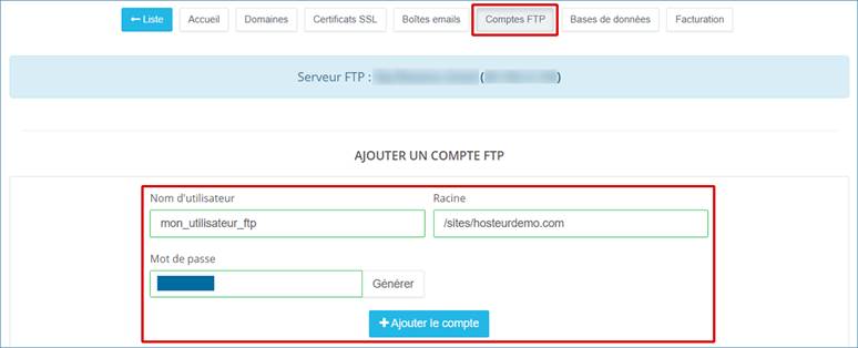 Note : la racine correspond au chemin vers le dossier sur lequel pointera votre compte FTP. Exemple : /sites/hosteurdemo.com Vous pouvez aussi ne rien mettre ou mettre juste un slash « / », mais en vous connectant sur le FTP, vous aurez accès à l'ensemble des dossiers contenant tous vos sites.