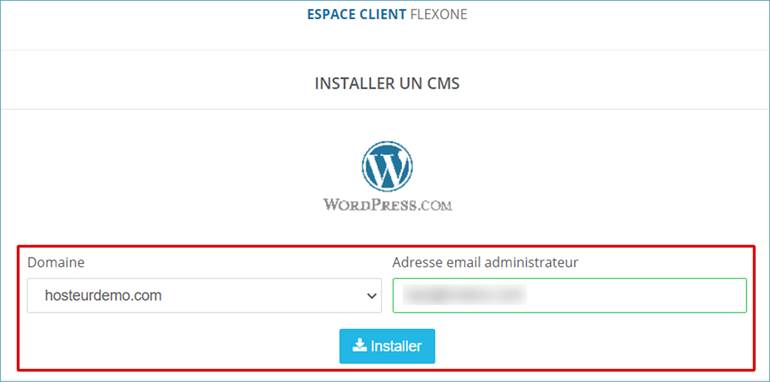 Allez dans votre Espace Client >> Services >> Flexone >> Détails >> Domaines et cliquez sur Installer un CMS.
