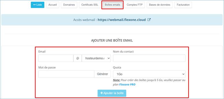 Depuis votre Espace Client, veuillez aller dans la rubrique Services >> Flexone >> Détails >> Boîtes emails. Complétez ensuite les informations requises et cliquez sur Ajouter la boîte.