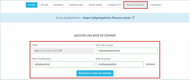 Rendez-vous dans votre Espace Client, rubrique Services >> Flexone >> Détails >> Bases de données et complétez les informations requises.