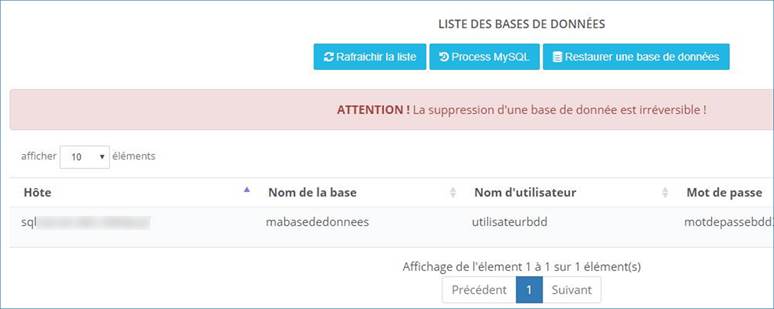 Au niveau de votre site web, votre fichier de configuration devra contenir les informations de la base de données. Le serveur de base de données (hôte) à utiliser est indiqué dans cette même rubrique. Vous trouverez à droite un bouton Modifier permettant de changer le mot de passe pour cette base de données ainsi qu'un bouton Supprimer" pour supprimer la base de données.
