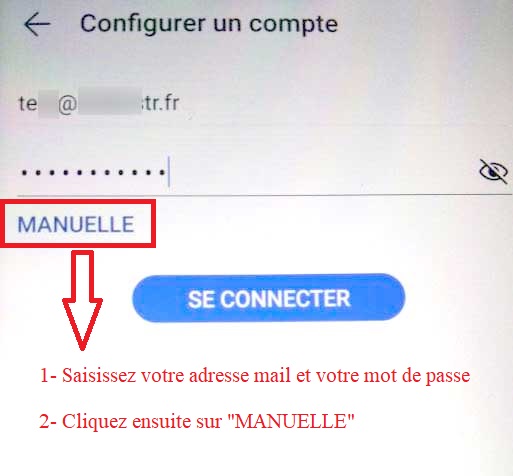 Entrer l'adresse mail à configurer et le mot de passe puis cliquez sur "MANUELLE" :