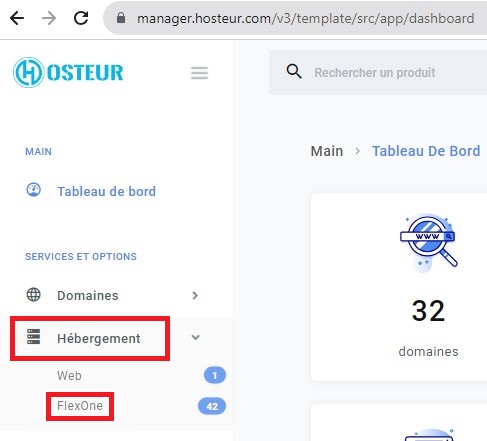1. Allez dans votre Espace Client (la page de connexion se trouve ici : https://manager.hosteur.com/), rubrique « Hébergements », « Flexone » puis cliquez sur la "Roue crantée" pour accéder au détail.