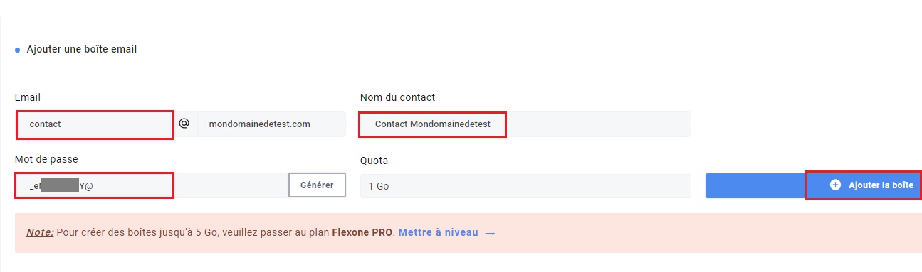 Depuis votre Espace Client, veuillez aller dans la rubrique Hébergement >> Flexone >> Roue crantée >> Gérer vos Boîtes emails. Complétez ensuite les informations requises et cliquez sur Ajouter la boîte.