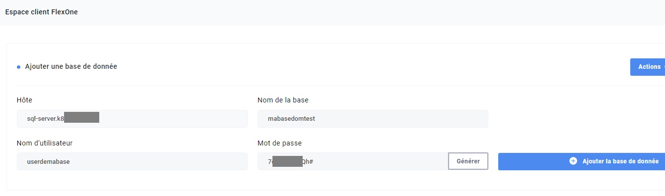 Rendez-vous dans votre Espace Client, rubrique Hébergement >> Flexone >> Roue crantée >> Gérer vos Bases de données et complétez les informations requises.