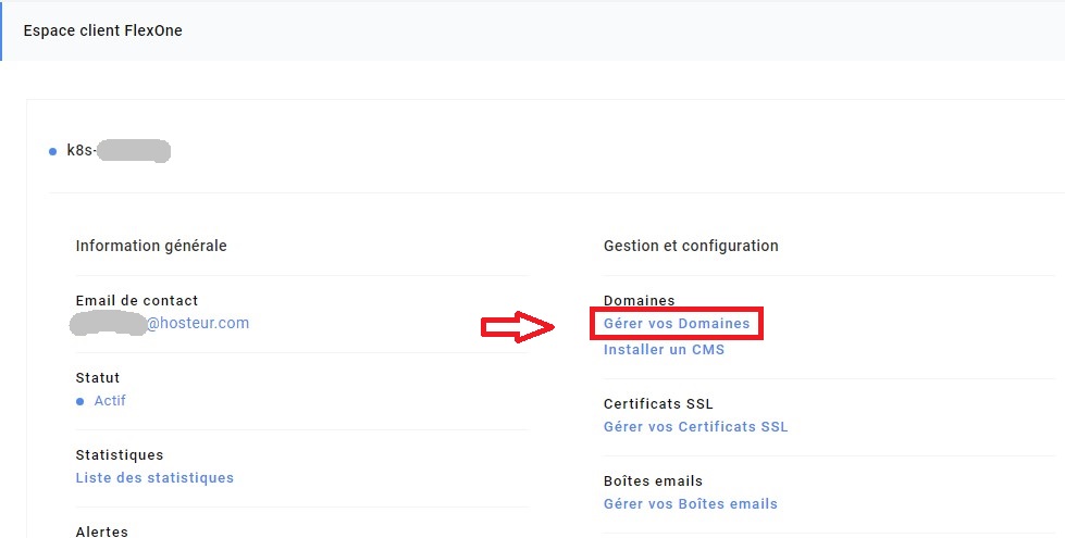 Vous devez également vérifier que votre nom de domaine utilise bien les serveurs DNS de Hosteur (dns1.hosteur.com et dns2.hosteur.com) et que votre nom de domaine pointe bien vers le serveur Flexone.