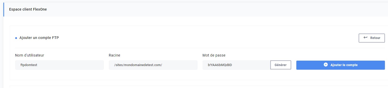 Note : la racine correspond au chemin vers le dossier sur lequel pointera votre compte FTP. Exemple : /sites/mondomainedetest.com/