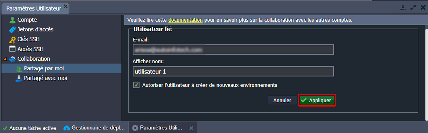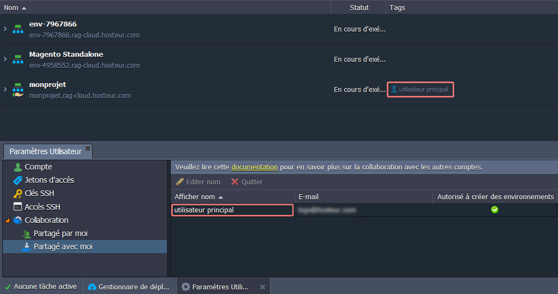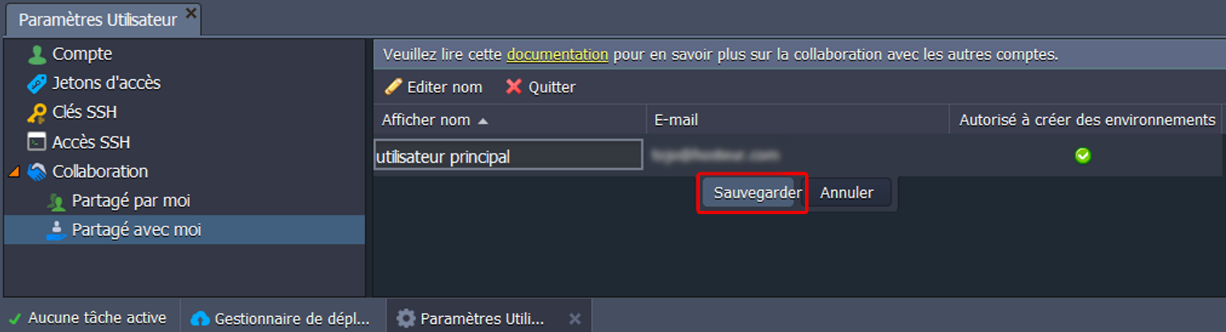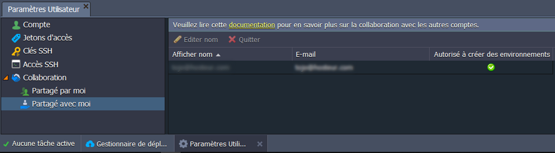 Un utilisateur ajouté à la collaboration n'a pas de droits d'administration spéciaux pour la gestion des comptes de collaboration (uniquement pour la gestion des environnements). Cet utilisateur peut simplement quitter la collaboration lorsque cela est nécessaire.