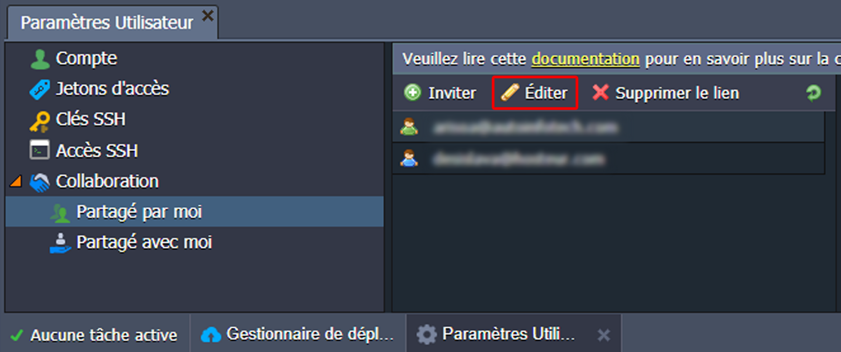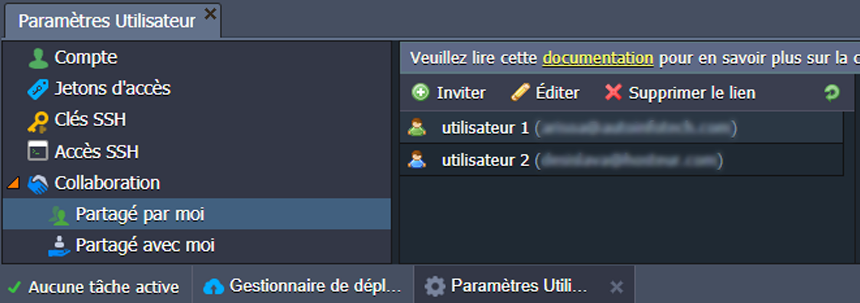 Après cela, cet utilisateur ne sera plus affiché sur la liste des membres de votre collaboration et ne pourra plus voir/gérer les environnements que vous avez partagés précédemment.