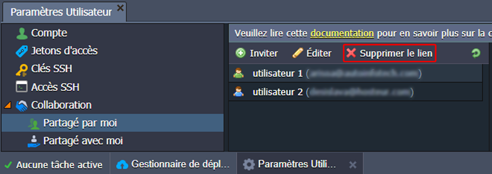 • Supprimer le lien pour supprimer un utilisateur de la collaboration.