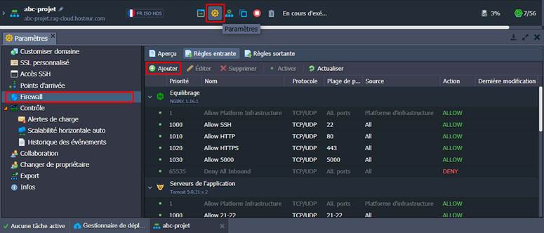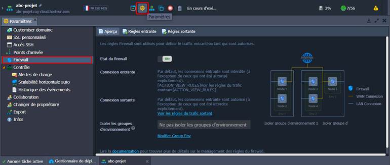 1. Pour accéder au panneau de contrôle approprié, cliquez sur le bouton Paramètres à côté de l'environnement requis et passez à la section Firewall dans l'onglet ouvert.