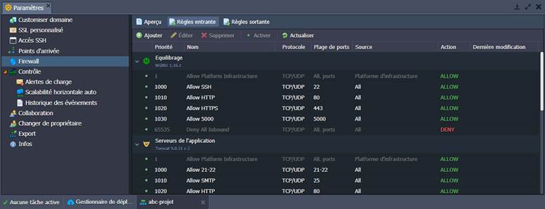 Chaque nœud de RAGNARØKKR PaaS (à l'exception des conteneurs personnalisés basés sur Docker et Windows) est doté d'un ensemble de règles de pare-feu, qui peuvent être examinées et gérées par le biais de l'interface utilisateur graphique intuitive de RAGNARØKKR. La section appropriée est accessible en cliquant sur le bouton Paramètres à côté de l'environnement requis et en sélectionnant l'élément de menu Firewall.