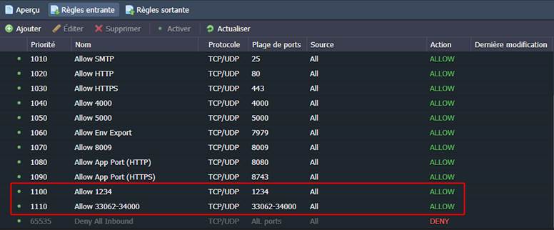 En travaillant avec le conteneur (par exemple, en ajoutant des points de montage, en installant un module FTP, etc.), la liste des règles de pare-feu par défaut peut être automatiquement complétée par la plateforme en fonction des nouvelles exigences. Ainsi, chaque enregistrement par défaut est ajouté avec une étape de priorité de 10 points, ce qui permet d'insérer des règles personnalisées entre les deux.