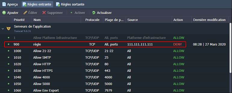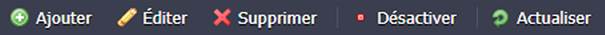 Pour faciliter la gestion des règles de pare-feu déjà existantes et fournir les nouvelles, le panneau d'outils situé au-dessus de la liste contient un ensemble de boutons, à savoir Ajouter, Editer, Supprimer, Désactiver (Activer) et Actualiser.