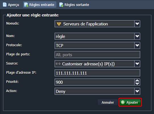 - Source : choisissez l'option Customiser adresse(s) IP et tapez l'IP nécessaire dans le champ « Plage d'adresse IP » (111.111.111.111)