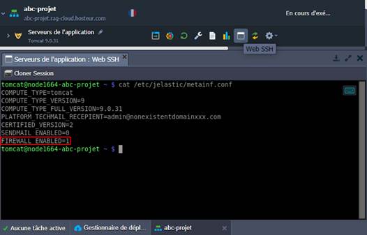 1. La façon la plus simple d'accéder à un nœud via SSH est d'accéder à l'option Web SSH appropriée directement depuis le tableau de bord RAGNARØKKR : cliquez sur le bouton du même nom à côté du nœud souhaité. Une fois connecté, vérifiez le fichier /etc/jelastic/metainf.conf pour vous assurer que le pare-feu du conteneur est activé :