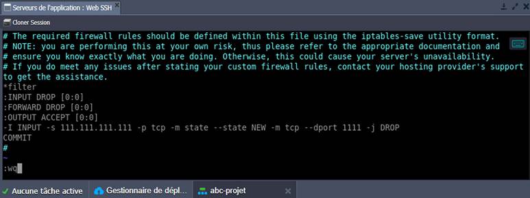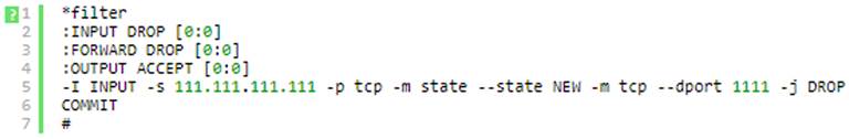 3. Déclarer les règles de pare-feu requises en utilisant le format de l'outil iptables-save. Par exemple, le code suivant doit être utilisé pour refuser l'accès à partir d'une IP particulière (par exemple 111.111.111.111) :