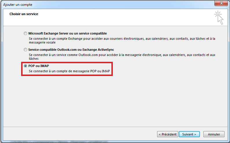 5- Choississez de préférence le type de compte IMAP et complétez les champs requis comme suit :