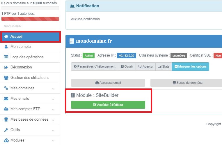 Pour accéder à l'éditeur de site web SiteBuilder, vous devez vous connecter à votre panel Merloz, vous y trouverez ensuite un lien "Accéder à l'éditeur".