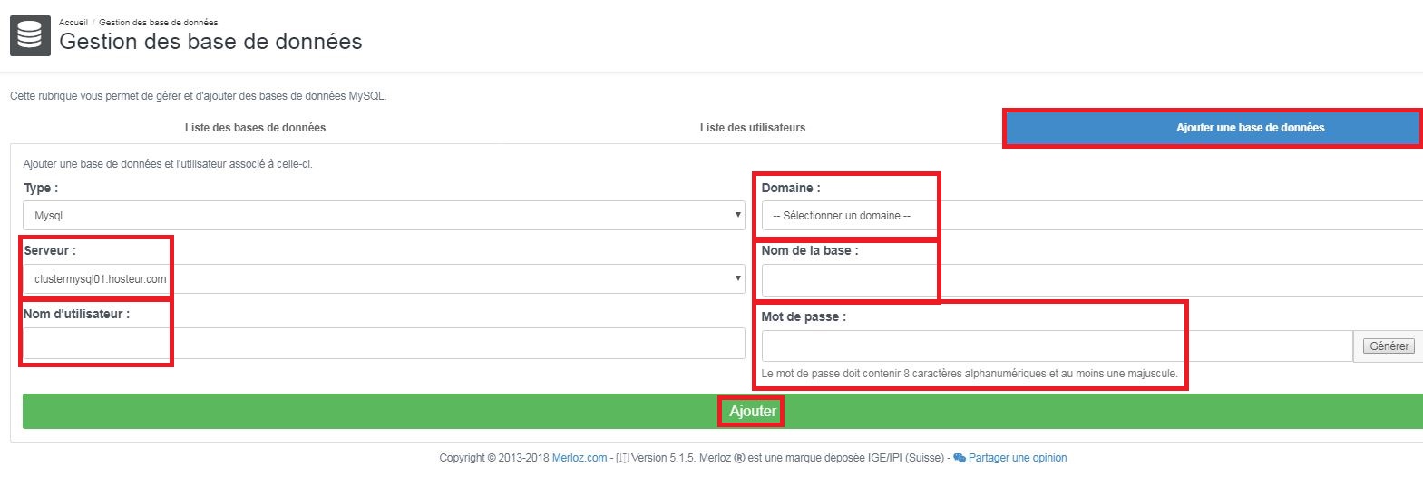 Pour ajouter une base de données, vous devez compléter le formulaire que vous trouverez dans la rubrique "Ajouter une base MySQL".