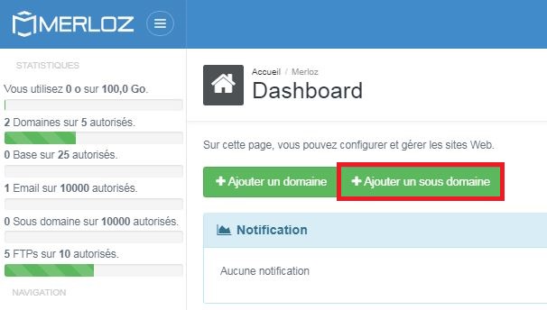 Pour créer un sous domaine, vous devez aller dans "Ajouter un sous domaine" depuis votre Merloz et saisissez le nom du sous-domaine à créer.